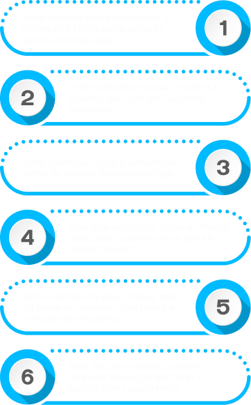 O método que ensina é o mesmo que aplica na prática para analisar imóveis, definir limites de lance, calcular retorno e decidir entre revenda ou aluguel, mesmo para quem investe morando no Brasil.